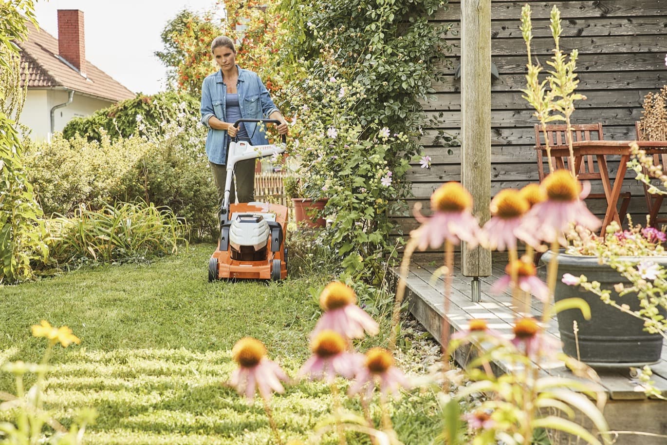 kvinna klipper gräsmatta med batteridriven gräsklippare