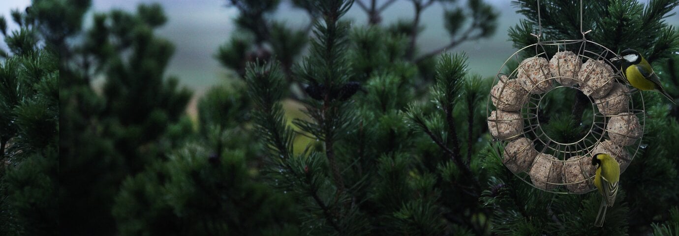 hjul med talgbollar i trädgård och fåglar som äter från dem. Till artikeln: Gör egna talgbollar - hitta recept på granngården.se