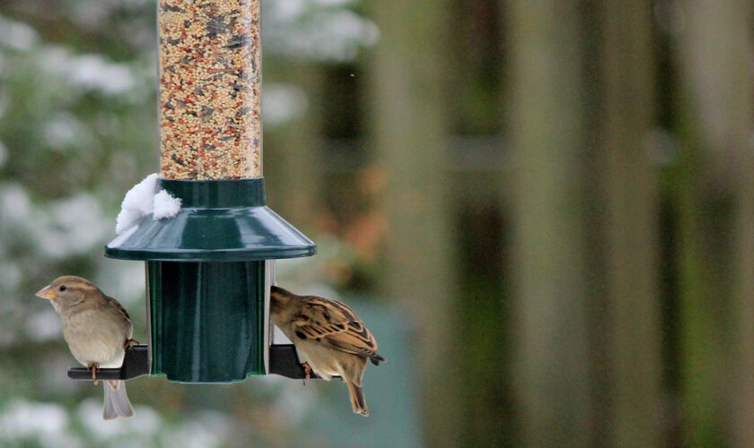 För att mata småfåglar utan att skator tar över kan du välja fågelmatare med små öppningar. Det gör att mindre arter kommer åt maten medan de större får svårare att nå den.