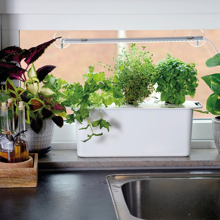 Växtbelysning är din bästa vän i köket och du behöver inte tänka så mycket på var du placerar dina odlingar. Bordet, fönsterbrädan eller köksbänken funkar alldeles utmärkt som ytor där du kan placera en energisnål växtlampa ovanför.